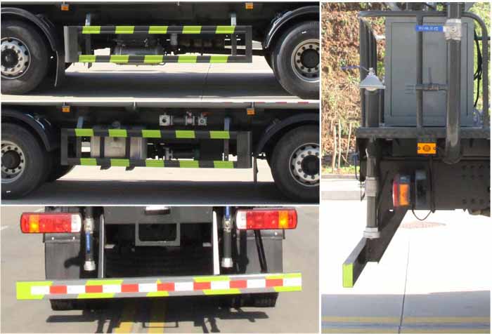 該車主要用于城鄉園林綠化噴灑作業;主要裝置為水罐及噴灑裝置;運輸介質:丙酮水溶液,介質密度:950千克/立方米.罐體總容量:16.59立方米;罐體有效容積:15.8立方米;罐體外形尺寸(×長軸×短軸)(mm):6800×2400×1450.側、后防護材料均為:Q235碳鋼,連接方式均為:螺栓連接,后部防護截面尺寸(mm):120×50,后部防護離地高度(mm):490;ABS系統型號/生產企業:CM4XL-4S/4M,廣州瑞立科密汽車電子股份有限公司.該車隨底盤安裝限速裝置,限速89km/h.選裝前部不帶電子水炮,該狀態下車長為10150mm;當前部安裝電子水炮時,車長為10650mm,車輛前伸500mm.選裝前部電子水炮裝置樣式,選裝車輛前部鴨嘴裝置.