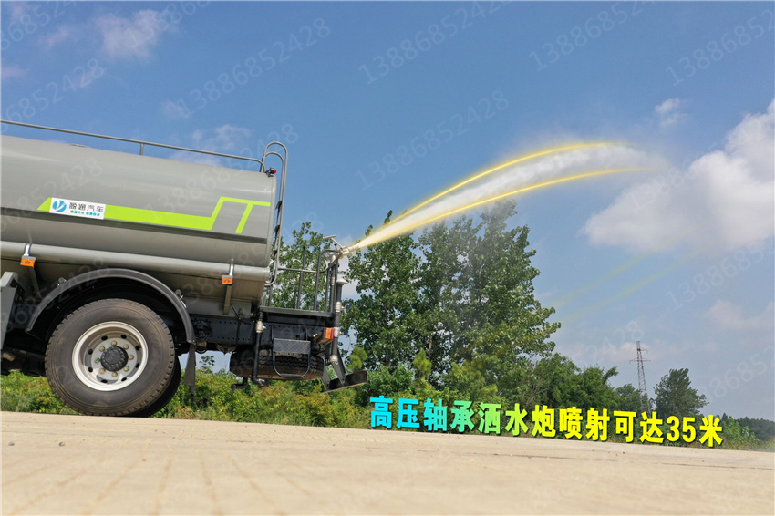 罐體材料選用武鋼優質材料制作,灑功能為:自吸高度≤7米,前沖后灑(灑水寬度≥14米)帶側噴,罐體后帶工作平臺,平臺上安裝綠化灑水高壓炮(炮噴射形狀可調成直沖狀、大雨、中雨、毛毛雨,炮可360°旋轉,水柱射程≥28米,霧狀射程≥5m),配備全國質量評比名的大功率灑水泵(日本技術),泵可自吸自排,帶自流閥,帶消防接頭,帶消防水帶,配兩根吸水管,帶過濾裝置。罐體油漆采用金屬油漆制作,銹能力強。罐體顏“上白下藍”,可以噴“灑或單位名稱”字樣。