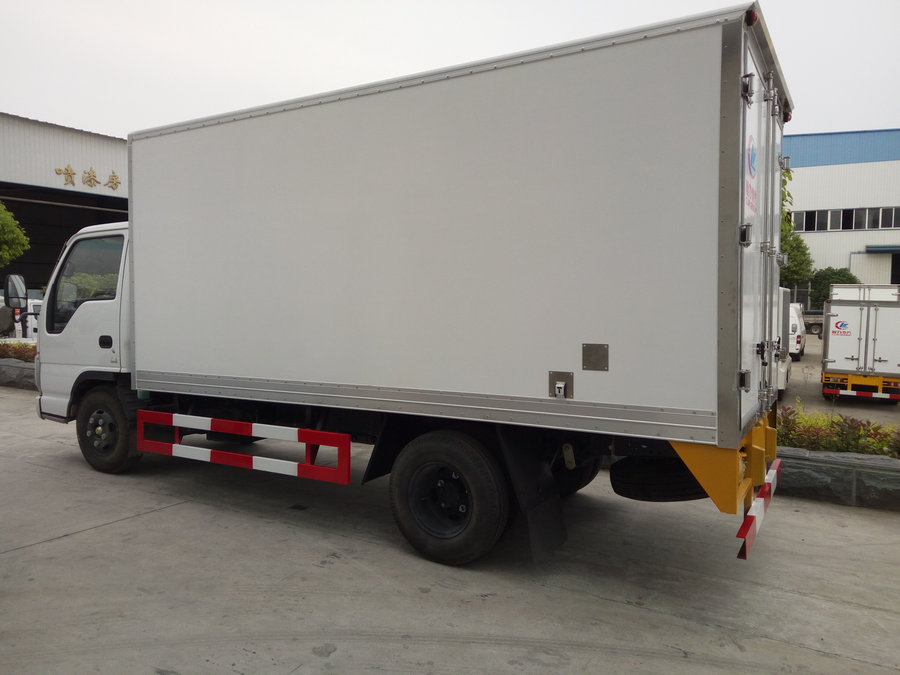 冷藏車廂體:采用國標A級聚氨酯保溫材料,厚度為8厘米,廂體內外采用玻璃鋼材質全包裹。不銹鋼鎖件。包角、包邊鋁合金型材。底盤采用高強度花紋鋁板定制。可選裝肉鉤導軌,和底部通風槽