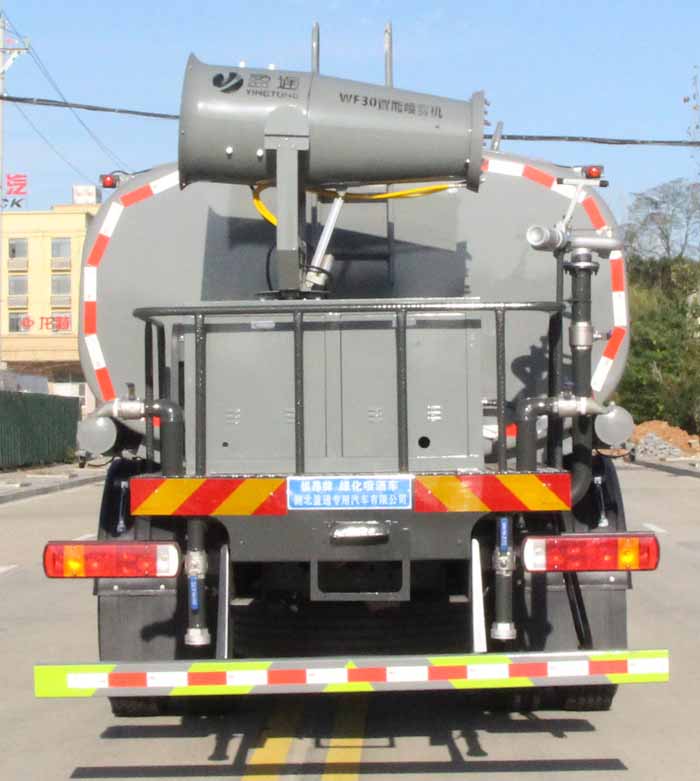 該車主要用于城鄉園林綠化噴灑作業;主要裝置為水罐及噴灑裝置;運輸介質:丙酮水溶液,介質密度:950千克/立方米.罐體總容量:16.59立方米;罐體有效容積:15.8立方米;罐體外形尺寸(×長軸×短軸)(mm):6800×2400×1450.側、后防護材料均為:Q235碳鋼,連接方式均為:螺栓連接,后部防護截面尺寸(mm):120×50,后部防護離地高度(mm):490;ABS系統型號/生產企業:CM4XL-4S/4M,廣州瑞立科密汽車電子股份有限公司.該車隨底盤安裝限速裝置,限速89km/h.選裝前部不帶電子水炮,該狀態下車長為10150mm;當前部安裝電子水炮時,車長為10650mm,車輛前伸500mm.選裝前部電子水炮裝置樣式,選裝車輛前部鴨嘴裝置.